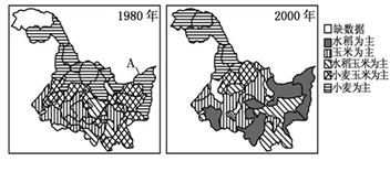 材料二:1980年和2000年黑龙江省三大粮食作物分布示意图。