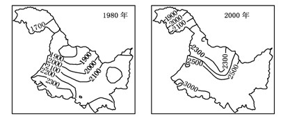 1980年和2000年黑龙江省积温(℃)等值线分布示意图。