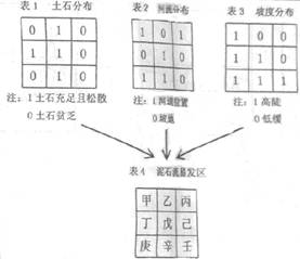 4、单选题 某市泥石流易发生在下列三项条件都同时具备的地方:(1)河道;(2)陡坡;(3)大量松散土石分布。该市的地理信息经数字化后,处理分析得出表4,如左图。读下面两图,完成18~19题。