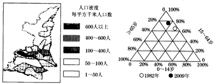 4、单选题 读我国某省区人口密度分布图和该省区人口年龄结构变化图,回答1—2题。