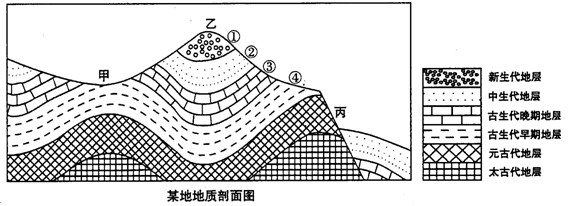 (1)地质剖面图上,甲、乙、丙三处的地质构造分别是________、________、________。