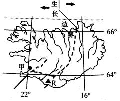 【小题2】由图可知R火山与首都(甲)基本位于64°N上,两地的经度差大约是3°,结合纬线长度的变化规律可知64°纬线上1°=111cos64°,R火山距离首都(甲)约为3×111cos64°,接近3×111cos60°=167千米,故选项C正确。