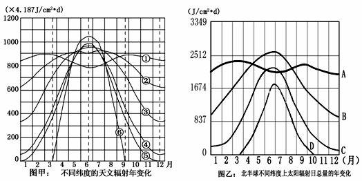 4、单选题 天文辐射指的是大气上界的太阳辐射,图甲、乙中的曲线表示不同纬度的天文辐射(大气上界的太阳辐射)的年变化和北半球不同纬度地面太阳辐射的年变化,读图完成下列各题。