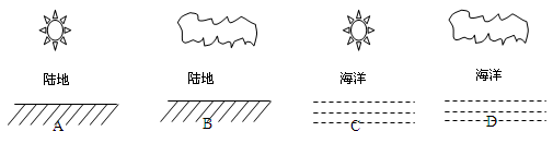 本题解析:昼夜温差的大小和地面的性质及大气保温作用的强弱有关,陆地和海洋的比热容不同,海洋的比热容较大,增温降温都缓慢,昼夜温差小;阴天和晴天相比,多云的白天大气的削弱作用和多云的夜晚大气的保温效应要强,也会使得昼夜温差减小,所以有云的海平面的昼夜温差是最小的,故D正确。
