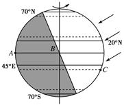 (2)注意此时极昼、极夜的范围,太阳直射点的位置,光线要与晨昏线垂直,A点要在赤道上,C点位于南回归践上。