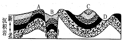 参考答案:B 本题解析:地质构造是地壳运动留在岩层中的印记。正确的顺序是先形成沉积岩层,再出现内力与外力作用留下的痕迹—地质构造。几 幅图对比,可知④最早(先形成沉积岩层),其次为③(沉积岩层受内力作用形成褶皱),褶皱受外力的侵蚀作用形成②,后经外力沉积作用形成①,再经过内、外力塑造形成⑤,B正确。 本题难度:一般 4、单选题 冰壶也称“冰上溜石”,其形状为圆壶状,由天然花岗岩制成。 参考答案:1、C 本题解析: 本题难度:简单 5、综合题 读地质构造示意图,回答下列问题(9分) 参考答案:(1)C(1分),D(1分), A(1分),B(1分) ,D(1分) 本题解析: 本题难度:简单 |