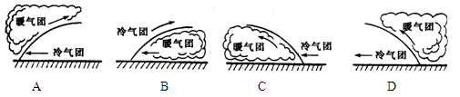 锋面总向冷气团一侧倾斜,冷锋天气为冷空气主动向暖气团进攻,所以本题选择A选项。