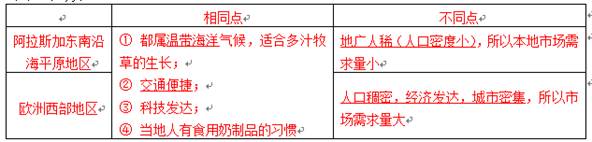 (3)阿拉斯加东南沿海平原地区与欧洲西部地区,都属温带海洋气候,适合多汁牧草的生长。两地的交通便捷,科技发达,当地人有食用奶制品的习惯这是两地的相同点。但是阿拉斯加东南沿海平原地区,地广人稀,人口密度小,本地市场需求量小。欧洲西部地区人口稠密,经济发达,城市密集,市场需求量大,这是两地的不同点