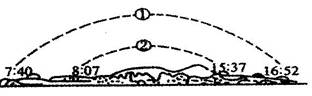 2、单选题 下图为我国①、②两地某日日出日落(北京时间) 示意图。根据你的生活经验和所学知识,判断该日最有能是 ( )