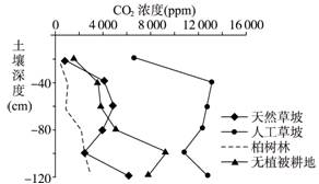本题解析: 小题1:相同深度土壤空气中CO2浓度最大的为人工草坡,因此最易被溶蚀。 小题2:喀斯特地貌地区植被破坏后,最终会导致石漠化。