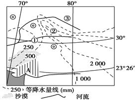 【小题1】由图可知,①③两地降水少,②地降水多,故与①③两地比较,②地光照最弱。