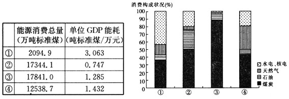 D、④省区石油消费量最高,能源消费结构较为均衡