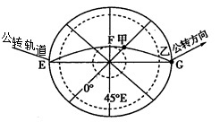 【小题1】根据地球公转运动的方向判断F点的地方时为12:00。45°E的地方时为0:00,则0°经线的地方时为21时。所以本题选择D选项。