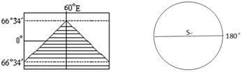 3、综合题 该图左图为某日某时昼夜分布情况,斜线区为黑夜,据此完成下列各题。(10分)