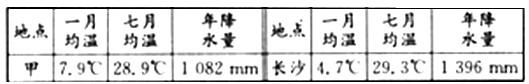 材料三:图中甲和长沙两城市的气候资料