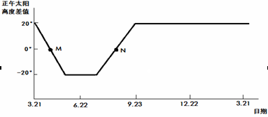 此题是对正午太阳高度这一概念的综合考查。一个地点的正午太阳高度和它当天与太阳直射点的纬度差有关。M、N两日,甲乙两地正午太阳高度值相等,所以,这两日太阳直射点与甲乙两地纬度差相等,答案C说法正确。从图中可以读出,从9月23日到次年的3月21日,甲乙两地正午太阳高度的差值为一个定值20?,说明当太阳直射南半球时,甲乙两地与太阳的纬度差值一直为一个定值20 ?,所以,甲乙两地都在北半球,并且两地纬度相差20 ?。答案B说法正确,而D错误。从3月21日到9月23日,甲乙两地有两次正午太阳高度相等,说明在这半年当中,有两天太阳直射的纬线正好在甲乙两地所在的两条纬线的正中间,并且,在6月22日前后的一段时间,甲乙两地正午太阳高度的差值为一个定值-20(甲乙的纬度差为20度),说明这段时间太阳直射点在甲和乙的同一侧,综合这两点可以得出结论,甲和乙都在赤道和北回归线之间,一年有两次直射机会,所以A说法正确。