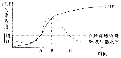 经济发展与环境关系示意图 (1)图中A—B阶段的主要产业可能有 ?[? ] ? ?A、航天工业 ?B、煤炭工业 ?C、钢铁工业 ?D、微电子工业 (2)人类社会处在A—B阶段时,人地矛盾日益突出。环境问题产生的主要原因是: ? ①_________________________________________________________________________________ ? ②_________________________________________________________________________________? ? ③_________________________________________________________________________________ (3)一些发达国家的环境污染水平于B点以后发生转变,其原因是①增加环保投入②科学技术进步③产 ? 业结构调整 ④工业发展迅速减慢⑤城市化水平不断提高 ? [? ] ?A、①②⑤ ?B、①②③ ?C、②③④ ?D、②③⑤ (4)当进入C阶段后,人地关系协调发展,真正实现了可持续___________、可持续___________、可持 ? 续___________。 (5)列举你日常生活中符合可持续发展观念的具体做法_____________、____________(列举两例)。