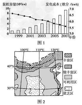 图1是全球风电装机容量和发电成本变化图,图2是某区域风能资源分布图。