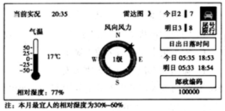 【小题2】华北地区为温带季风区,当地盛行风向为夏季东南风冬季西北风,而图中显示风向为东北风A错误;该日相对湿度较大,与最宜人的相对湿度差异较大,故不宜户外锻炼B正确;由于风力较小,所以不利于污染物的扩散C错误;气温显示17℃,不用着厚外套加毛衣D错误。