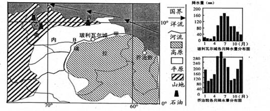 (4)(共8分)该国降水季节变化明显(干湿季明显),洪涝与旱灾较多(2分);上游山区建水库,可以防止洪涝灾害与旱灾对农业的影响(2分);中下游平原地势低平(2分),湿季需要排涝,干季需灌溉,水利工程建设可以解决这些问题(2分)。