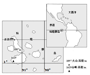 【小题2】岛上生活着耐寒的企鹅,是因为秘鲁寒流势力强,该地受寒流影响,C对。该地位于赤道附近,气温日较差小,A错。该地是大洋中的岛屿,与大陆不相连,不在动物迁徙路线上,B错。根据图中山峰海拔高度,气候垂直差异不明显,D错。