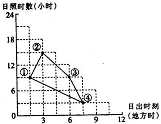 1.由题干6月22日太阳直射北半球,根据昼夜长短与日出的关系,在6点日出为赤道③,为昼夜平分,6点后日出为南半球④,为昼短,6点前日出为北半球①②,为昼长。