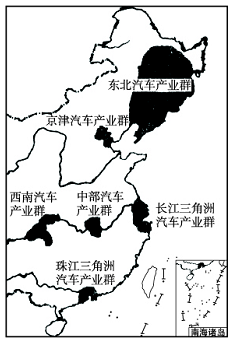 小题1:从我国六大汽车产业群分布的位置分析,这些地区交通便利;人口较多,市场广阔;工业发达,工业基础条件好;都是经济发达区,资金充足,技术条件好;但长江三角洲和珠江三角洲地区的矿产资源缺乏。故选B。