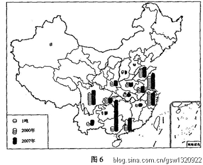 答案要点二:东部原产量大,增长量较少,中部有明显增长,但总产量相比不大;西部以广西为代表增长迅速;主产区由东部转移到西部(总产量2000年以东部最多,2007年以西部最多)。