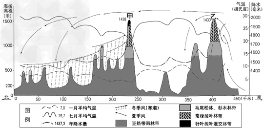 4、单选题 下图为我国南岭山地中段的自然景观剖面图。读图,回答1~3题。