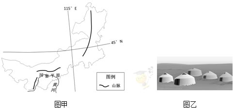 2008年,《中国国家地理》推出以“物产丰富、生态环境良好、发展具有可持续性……”为标准的“新天府”评选,图中河套平原被列入我国的“新天府”名单。图甲是我国某省区略图,图乙为该省区传统民居景观示意图。