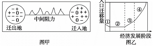 1.图甲表示人口迁移的拉力和推力示意图,“+”号表示一个地区吸引人口的因素,“一”表示一个地区排斥人口的因素,“0”表示无关的因素。下列表示推力因素的是2.近年上海、北京、广州等城市,对优秀人才的进人取消了户口限制,这种行为