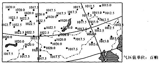 (1)根据图中气压分布状况,在图中画出等压线,并用正确的图例画出锋线(4分)