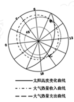 4、单选题 下图为我国某地某日大气热量收支状况和太阳高度变化示意,图中放射线数值表示北京时间,同心圆数值表示太阳高度,热量值从外圆到圆心由小到大。读图回答23-24题。