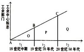 4、单选题 读下面的工业发展过程示意图,t1、t2、t3为三个发展阶段,A、B、C为三次技术革命的标志,O、P、Q为工业中心及工业部门。完成(1)~(2)题。