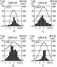 本题解析:解答本题的关键是根据各图所提供气温和降水资料,判读出各幅图所代表的气候类型,重点弄清所属的温度带。因题干界定的范围是在东部季风区中,故四幅图自南而北大致可排列为丙、乙、丁、甲。从气温和降水特点可看出:甲—中温带季风气候,乙—亚热带季风气候,丙—热带季风气候,丁—暖温带季风气候。甘蔗生长于热带、亚热带,更适宜生长于热带,甜菜适宜生长在温凉的中温带。最后结合初中地理知识即可答出甜菜的主要产区及红壤的改良措施。