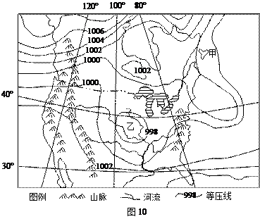 5、综合题 图10为某区域七月等压线(单位:百帕)分布图。读图,完成下列问题。