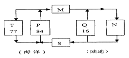 【小题1】读图,指向M的箭头只与两个数值有关,P是海水蒸发84,T代表有77以降水形式落回海洋,所以指向M的只有7个单位。指向N的两个数值,一个是M为7,另一个是Q是16,所以N是23。选项C对。A、B、D错。
