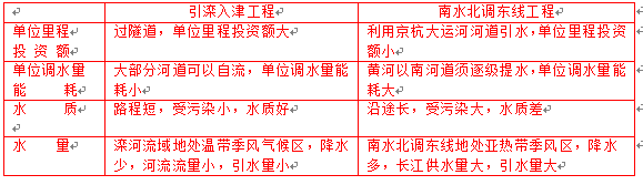 (3)读图,引滦入津工程是把滦河水引入天津,缓解天津市 的缺水问题。从图中看,引滦入津工程,始自北部山区,要开凿隧道,单位里程投资额大。开通后,因大部分河道可以自流,所以单位调水量能耗小。调水路程短,沿途受污染小,水质好。不利之处是滦河流域地处温带季风气候区,降水少,河流流量小,导致引水量小。