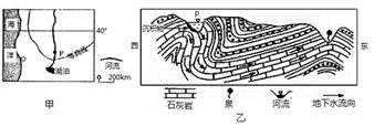 本题解析:根据甲图等高线形态,河流流向与等高线弯曲方向相反,可判定河流由南向北流。根据乙图中岩层的弯曲状况,可判断河谷处的地质构造为背斜。根据P地河谷剖面,沉积物位于河谷西侧,东侧受侵蚀,可判断此地位于北半球。结合甲图P地位于大陆西岸,纬度大为38°(据比例尺推算),可判断P地为地中海气候,冬季多雨,地表水补给地下水,使泉水涌水量大。
