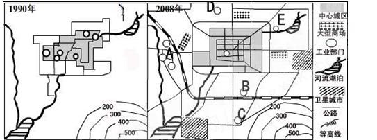 5、单选题 下图是我国某城市发展过程中1990年和2008年比较图,读图回答15-17题。