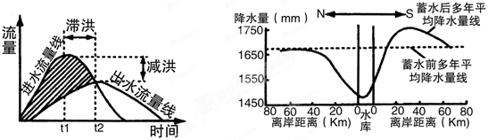 4、单选题 水库具有多种功能,如防洪、发电、灌溉、养殖等,并且能改善局部地区的气候。下面左图是某水库洪水时径流调节示意图,右图是某水库蓄水前后对库区周围地区降水量的影响示意图。读图回答以下问题。