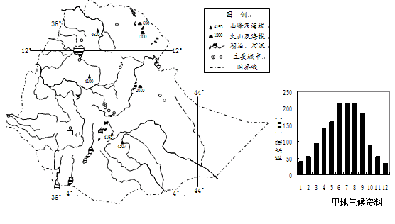(2)①丰富(约1500毫米) 原因:位于埃塞俄比亚高原西南部,地势高且面积宽广,对来自海洋的西南暖湿气流进行有效阻截和抬升,形成地形雨,获得丰富的雨水。 ②夏 原因:夏季盛行来自海洋的西南风,在地形抬升作用下,形成丰富的降水;冬季,盛行干燥的东北风,且处于背风坡,降水较少。