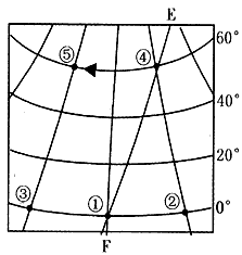 5、单选题 ? 图中EF线是地球公转到近日点附近的晨昏线,箭头为地球自转方向,①点是东半球与西半球分界线,③点位于西半球,①点与②、③两点的最短距离是3330km。据此回答1—4题。