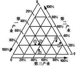 1.国家⑤的三个产业按就业构成自高至低排列, 依次是2.图中①、②、③、④是四个人口超过1亿的国家,其中经济发展水平最高的是3.图中五个国家中工业化程度最低的是