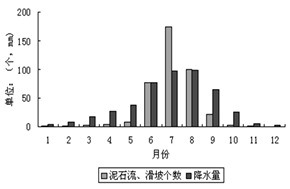 (1)说出图中红树林海岸的主要分布区,并分析其成因。(6分) (2)比较台湾东西两岸港口数量的差异,并分析其主要原因。(9分) B.【选修5——自然灾害与防治】 下图是西藏泥石流、滑坡次数与各月降水量分布图,读图回答:
