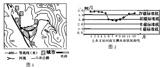 (1)据图2,描述②处河流水质随时间变化特点,并说出影响因素(6分) (2)简述针对A处河流水质全年都比较差的防治措施(9分)