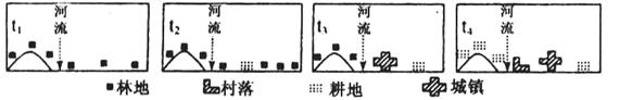 A.人口稠密、汽车数量大 B.城市化水平高,森林绿地比重低 C.经济发达,工厂企业多 D.强冷空气南下,气温下降 2、单选题 下图为一组剖面示意图,反映了我国华北某地区土地利用状况由t1时期→t4时期的历史变化过程(t1时期→t4时期气候变化甚微,可忽略不计;图中河流断面位于中游处)。据此完成下列问题。 |