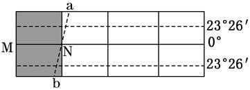 (3)当线段ab与该经线夹角约为15°时,直射点坐标约为__________________。(2分)