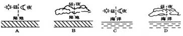 本题解析:本题考查大气的热力状况。由于海陆热力性质的差异,海洋的昼夜温差小于陆地;阴天白天,大气对太阳辐射的反射作用强,晚上云层的保温作用强,故海洋上的阴天昼夜温差最小。