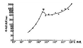 2、单选题 下图为中国部分区域多年平均径流深【径流深R,指计算时段内的径流总量平铺在水文测站以上流域面积上所得的水层厚度,它的常用单位为毫米(mm).若时段为△t(s),平均流量为Q(m3/s),流域面积为A(km2),则径流深R(mm)由下式计算:R=Q△t/(1000A)。平均径流深则为径流深的多年平均值】1随经度的变化示意图,图中选取的是沿台湾—江西—四川—青海等省一线水文观测站(图中小圆点)以上流域面积的数据.回答问题。